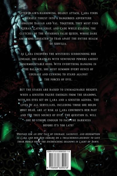 In the riveting sequel to Shadows of Dusk, the fate of two worlds hangs in the balance as darkness threatens to devour everything in its path. After Blair's harrowing, deadly attack, Lara finds herself thrust into a dangerous adventure alongside Darian and Val. Together, they must find Kieran, Zayne, Gray, and Cade while evading the clutches of the nefarious false Queen, whose dark ambitions threaten to tear apart the entire realm of Servilia. As Lara uncovers the mysteries surrounding her lineage, she grapples with newfound powers amidst insurmountable odds. With everything hanging in the balance, she must summon every ounce of courage and cunning to stand against the forces of evil. But the stakes are raised to unimaginable heights when a sinister figure emerges from the shadows, with his eyes set on Lara and a sinister agenda. The lives of all Servilians, including those she holds most dear, are at risk as Lara confronts her past and the true source of evil. The question is, will she be strong enough to face the darkness before it's too late? Prepare for an epic tale of courage, sacrifice, and redemption as Lara and her men embark on a treacherous journey to save their world from the encroaching shadows in Light of Dawn.