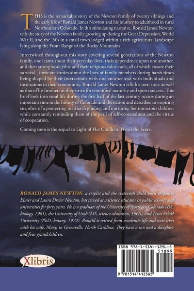 " This is the remarkable story of the Newton family of twenty siblings and the early life of Ronald James Newton and his journey to adulthood in rural Northeastern Colorado. In this stimulating narrative, Ronald James Newton tells the story of the Newton family growing up during the Great Depression, World War II, and the '50s in a small town lodged within a rich agricultural landscape lying along the Front Range of the Rocky Mountains. Intertwined throughout this story covering several generations of the Newton family, one learns about their everyday lives, their dependence upon one another, and their strong work ethic and their religious value code, all of which ensure their survival. These are stories about the lives of family members during harsh times being shaped by their interactions with one another and with individuals and institutions in their community. Ronald James Newton tells his own story as well as that of his brothers as they strive for emotional maturity and sports success. This brief look into rural life during the first half of the last century occurs during an important time in the history of Colorado and the nation and describes an inspiring snapshot of a pioneering matriarch guiding and nurturing her numerous children while constantly reminding them of the peril of self-centeredness and the virtue of cooperation. Coming soon is the sequel to Light of Her Children, Here's the Score."