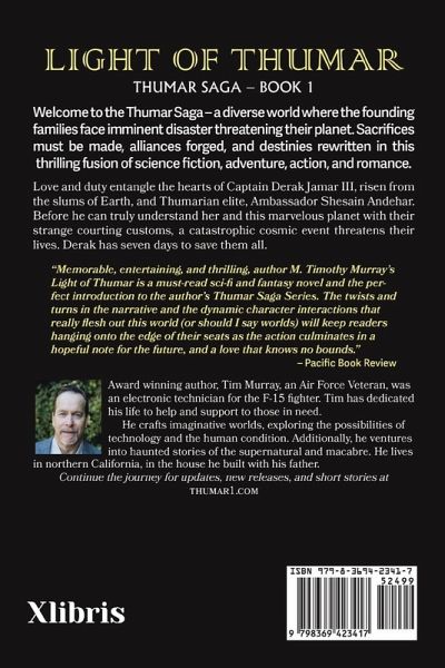 Welcome to the Thumar Saga- a diverse world where the founding families face imminent disaster threatening their planet. Sacrifices must be made, alliances forged, and destinies rewritten in this thrilling fusion of science fiction, adventure, action, and romance. Love and duty entangle the hearts of Captain Derak Jamar III, risen from the slums of Earth, and Thumarian elite, Ambassador Shesain Andehar. Before he can truly understand her and this marvelous planet with their strange courting customs, a catastrophic cosmic event threatens their lives. Derak has seven days to save them all. "Memorable, entertaining, and thrilling, author M. Timothy Murray's Light of Thumar is a must-read sci-fi and fantasy novel and perfect introduction to the author's Thumar Saga Series. The twists and turns in the narrative and the dynamic character interactions that really flesh out this world (or should I say worlds) will keep readers hanging onto the edge of their seats as the action culminates in a hopeful note for the future, and a love that knows no bounds." - Pacific Book Review