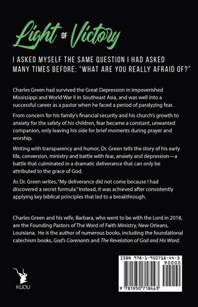 Charles Green had survived the Great Depression in impoverished Mississippi and World War II in Southeast Asia, and was well into a successful career as a pastor when he faced a period of paralyzing fear. From concern for his family's financial security and his church's growth to anxiety for the safety of his children, fear became a constant, unwanted companion, only leaving his side for brief moments during prayer and worship. Writing with transparency and humor, Dr. Green tells the story of his early life, conversion, ministry and battle with fear, anxiety and depression-a battle that culminated in a dramatic deliverance that can only be attributed to the grace of God. As Dr. Green writes, "My deliverance did not come because I had discovered a secret formula." Instead, it was achieved after consistently applying key biblical principles that led to a breakthrough.