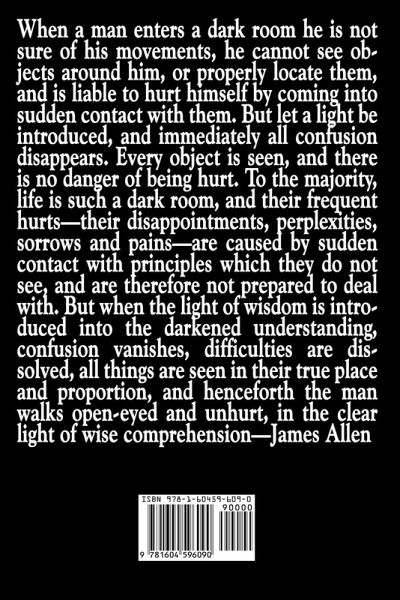 When a man enters a dark room he is not sure of his movements, he cannot see objects around him, or properly locate them, and is liable to hurt himself by coming into sudden contact with them. But let a light be introduced, and immediately all confusion disappears. Every object is seen, and there is no danger of being hurt. To the majority, life is such a dark room, and their frequent hurts-their disappointments, perplexities, sorrows and pains-are caused by sudden contact with principles which they do not see, and are therefore not prepared to deal with. But when the light of wisdom is introduced into the darkened understanding, confusion vanishes, difficulties are dissolved, all things are seen in their true place and proportion, and henceforth the man walks open-eyed and unhurt, in the clear light of wise comprehension-James Allen