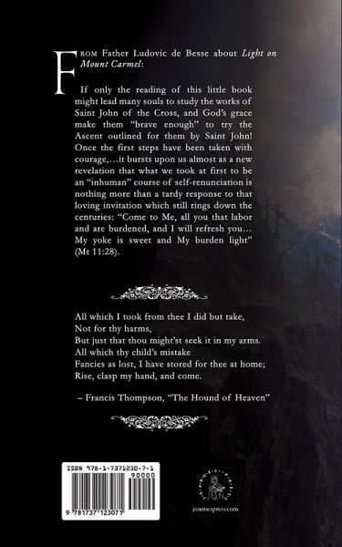From Father Ludovic de Besse about Light on Mount Carmel: If only the reading of this little book might lead many souls to study the works of Saint John of the Cross, and God's grace make them "brave enough" to try the Ascent outlined for them by Saint John! Once the first steps have been taken with courage,... it bursts upon us almost as a new revelation that what we took at first to be an "inhuman" course of self-renunciation is nothing more than a tardy response to that loving invitation which still rings down the centuries: "Come to Me, all you that labor and are burdened, and I will refresh you... My yoke is sweet and My burden light" (Mt 11:28). All which I took from thee I did but take, Not for thy harms, But just that thou might'st seek it in my arms. All which thy child's mistake Fancies as lost, I have stored for thee at home; Rise, clasp my hand, and come. - Francis Thompson, "The Hound of Heaven"