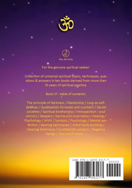 For the genuine spiritual seeker: Collection of universal spiritual topics, techniques, questions & answers in seven books derived from more than 16 years of spiritual practice. Book VI - table of contents: The principle of darkness / Mastership / Love as self-defense / Quabbalistic formulas and numbers / Secret societies / Spiritual brothership / Introspection - soul mirrors / Sleepers / Karma and Incarnation / Healing / Psychology / JHVH / Symbols / Psychology / Mental perfection / Healing techniques / Astral body building / Clearing technique / Quabbalistic wisdom / Negative beings / And much more...