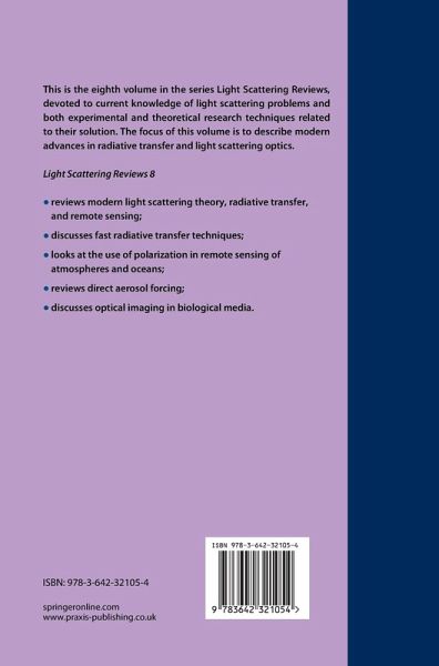 Light scattering review (vol 8) is aimed at the presentation of recent advances in radiative transfer and light scattering optics. The topics to be covered include: scattering of light by irregularly shaped particles suspended in atmosphere (dust, ice crystals), light scattering by particles much larger as compared the wavelength of incident radiation, atmospheric radiative forcing, astrophysical radiative transfer, radiative transfer and optical imaging in biological media, radiative transfer of polarized light, numerical aspects of radiative transfer. Light scattering review (vol 8) is aimed at the presentation of recent advances in radiative transfer and light scattering optics. The topics to be covered include: scattering of light by irregularly shaped particles suspended in the atmosphere (dust, ice crystals), light scattering by particles much larger as compared the wavelength of incident radiation, atmospheric radiative forcing, astrophysical radiative transfer, radiative transfer and optical imaging in biological media, radiative transfer of polarized light, numerical aspects of radiative transfer.