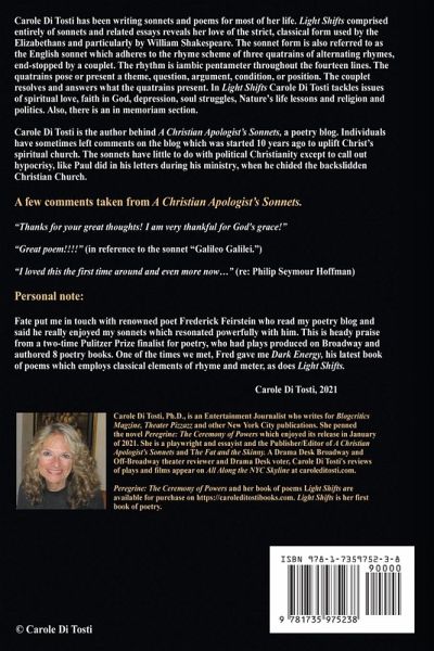 Light Shifts, comprised entirely of sonnets and related essays, reveals her love of the strict, classical form used by the Elizabethans and particularly by William Shakespeare. The sonnet form is also referred to as the English sonnet which adheres to the rhyme scheme of three quatrains of alternating rhymes, end-stopped by a couplet. The rhythm is iambic pentameter throughout the fourteen lines. The quatrains pose or present a theme, questions, argument, condition, or position. The couplet resolves and answers what the quatrains present. In Light Shifts, Carole Di Tosti tackles issues of spiritual love, faith in God, depression, soul struggles, Nature's life lessons, and religion and politics. Also, there is an in memoriam section.