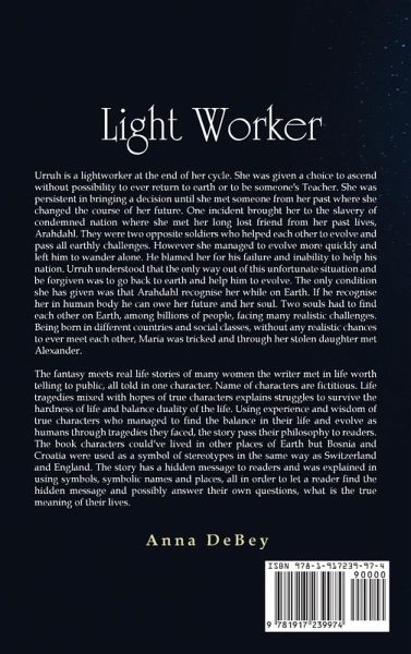 Urruh is a lightworker at the end of her cycle. She was given a choice to ascend without possibility to ever return to earth or to be someone's Teacher. She was persistent in bringing a decision until she met someone from her past where she changed the course of her future. One incident brought her to the slavery of condemned nation where she met her long lost friend from her past lives, Arahdahl. They were two opposite soldiers who helped each other to evolve and pass all earthly challenges. However she managed to evolve more quickly and left him to wander alone. He blamed her for his failure and inability to help his nation. Urruh understood that the only way out of this unfortunate situation and be forgiven was to go back to earth and help him to evolve. The only condition she has given was that Arahdahl recognise her while on Earth. If he recognise her in human body he can owe her future and her soul. Two souls had to find each other on Earth, among billions of people, facing many realistic challenges. Being born in different countries and social classes, without any realistic chances to ever meet each other, Maria was tricked and through her stolen daughter met Alexander. The fantasy meets real life stories of many women the writer met in life worth telling to public, all told in one character. Name of characters are fictitious. Life tragedies mixed with hopes of true characters explains struggles to survive the hardness of life and balance duality of the life. Using experience and wisdom of true characters who managed to find the balance in their life and evolve as humans through tragedies they faced, the story pass their philosophy to readers. The book characters could've lived in other places of Earth but Bosnia and Croatia were used as a symbol of stereotypes in the same way as Switzerland and England. The story has a hidden message to readers and was explained in using symbols, symbolic names and places, all in order to let a reader find the hidden message and possibly answer their own questions, what is the true meaning of their lives.