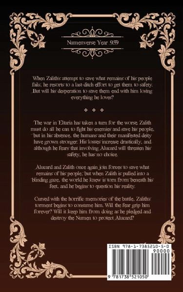 [This edition does not include the main character's dialogue accent] ¿ Book 3 of the Numen Chronicles ¿ When Zalith's attempt to save what remains of his people fails, he resorts to a last-ditch effort to get them to safety. But will his desperation to save them end with him losing everything he loves? *** The war in Eltaria has taken a turn for the worse. Zalith must do all he can to fight his enemies and save his people, but in his absence, the humans and their manifested deity have grown stronger. His losses increase drastically, and although he fears that involving Alucard will threaten his safety, he has no choice. Alucard and Zalith once again join forces to save what remains of his people, but when Zalith is pulled into a blinding gaze, the world he knew is torn from beneath his feet, and he begins to question his reality. Cursed with the horrific memories of the battle, Zalith's torment begins to consume him. Will the fear grip him forever? Will it keep him from doing as he pledged and destroy the Numen to protect Alucard? ¿ MxM Erotic Romance ¿ Gothic Suspense ¿ Soap Opera/Slice of Life ¿ (CW: explicit sexual content, dark fantasy themes, and mature subject matter)