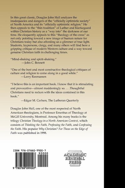 -------------------------------------------------------------------------------- Revised and with a Foreword by David J. Monge In this great classic, Douglas John Hall analyzes the inadequacies and dangers of the officially optimistic society of North America and its officially optimistic religion. He then appeals to the thin tradition of Luther and Kierkegaard within Christian history as a way into the darkness of our time. He eloquently appeals to this theology of the cross as not only pointing toward a new image of human nature for Christians today but also affording us a glimmer of true light. Students, laypersons, clergy, and many others will find here a gripping critique of modern Western culture and a way toward genuine Christian faith in challenging times. Mind-shaking and spirit-shaking. -- John C. Bennett One of the best and most constructive theological critiques of culture and religion to come along in a good while. -- Larry Rasmussen I believe this is an important book. I know that it is stimulating and provocative--almost maddeningly so. . . .Thoughtful Christians need to reckon with the ideas contained in this book. -- Edgar M. Carlson, The Lutheran Quarterly Douglas John Hall, one of the most respected of North American theologians, is Professor Emeritus of Theology at McGill University, Montreal. Among his many books is the trilogy Christian Theology in a North American Context, which consists of Thinking the Faith, Professing the Faith, and Confessing the Faith. His popular Why Christian? For Those on the Edge of Faith was published in 1998.