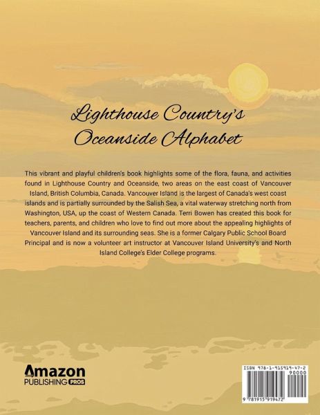 This vibrant and playful children's book highlights some of the flora, fauna, and activities found in Lighthouse Country and Oceanside, two areas on the east coast of Vancouver Island, British Columbia, Canada. Vancouver Island is the largest of Canada's west coast islands and is partially surrounded by the Salish Sea, a vital waterway stretching north from mWashington, USA, up the coast of Western Canada. Terri Bowen has created this book for teachers, parents, and children who love to find out more about the appealing highlights of Vancouver Island and its surrounding seas. She is a former Calgary Public School Board Principal and is now a volunteer art instructor at Vancouver Island University's and North Island College's Elder College programs.