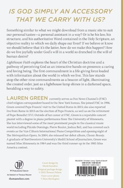 Is God Just a Distant Concept? An Award-Winning Religion Correspondent is Convinced the Answer is No and Explores the Possible Relationship with Our Creator Fox News Religion Correspondent Lauren Green uses her wealth of stories, vast network of contacts, and her own extensive study of theology to take the reader on a unique journey of spiritual discovery. With few female authors writing in the field of theology, Green provides an important perspective to all who wish to move closer to not only a deeper relationship with God but an understanding of what makes that possible. Green gathers insight from some amazing guides along the way, through personal conversations with some of the leading minds in the world on the topic of Christianity. These include: * Timothy Keller * John Piper * Alister McGrath * William Lane Craig * John Lennox * Sir John Polkinghorne * Amy Beckman * Elizabeth Lev * ... and many more Is God simply an accessory that we carry with us? Something similar to what we might download from a music site to suit our personal tastes--a personal assistant in a way? Or is He His law, His structure, and His authoritative Word contained in the Holy Scripture, an objective reality to which you daily shape your life? If we believe or know we should believe that it's the latter, how do we make this happen? How do we live joyfully under God's will in a world so drenched in the will of human desire? Lighthouse Faith explores the heart of the Christian doctrine and a pathway of perceiving God as an interactive hands-on presence, a caring and loving being. The first commandment is a life-giving force loaded with information about the world in which we live. This law stands atop the other nine commandments as a beacon of light, illuminating the created order, just as a lighthouse lamp shines in a darkened space, heralding a way to safety.
