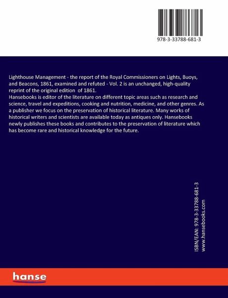 Lighthouse Management - the report of the Royal Commissioners on Lights, Buoys, and Beacons, 1861, examined and refuted - Vol. 2 is an unchanged, high-quality reprint of the original edition of 1861.Hansebooks is editor of the literature on different topic areas such as research and science, travel and expeditions, cooking and nutrition, medicine, and other genres. As a publisher we focus on the preservation of historical literature. Many works of historical writers and scientists are available today as antiques only. Hansebooks newly publishes these books and contributes to the preservation of literature which has become rare and historical knowledge for the future.