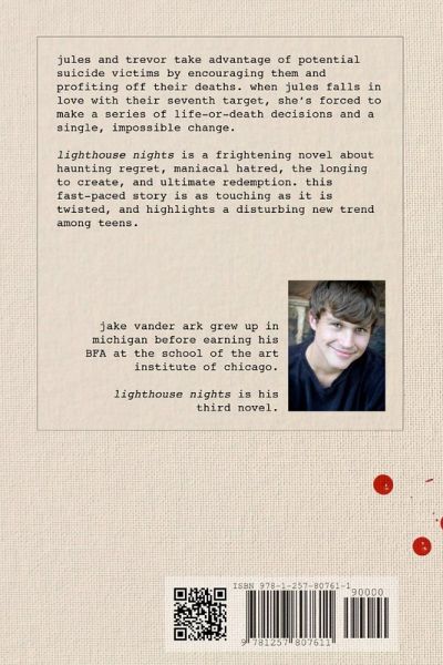 Jules and Trevor take advantage of potential suicide victims by encouraging them and profiting off their deaths. When Jules falls in love with their seventh target, she's forced to make a series of life-or-death decisions and a single, impossible change. "Lighthouse Nights" is a frightening fairytale about haunting regret, maniacal hatred, the longing to create, and ultimate redemption. This fast-paced story is as touching as it is twisted, and highlights a disturbing new trend among American teens.