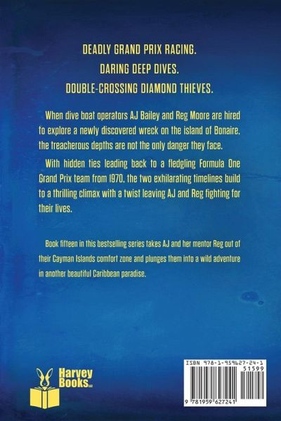 Deadly Grand Prix racing. Daring deep dives. Double-crossing diamond thieves. When dive boat operators AJ Bailey and Reg Moore are hired to explore a newly discovered wreck on the island of Bonaire, the treacherous depths are not the only danger they face. With hidden ties leading back to a fledgling Formula One Grand Prix team from 1970, the two exhilarating timelines build to a thrilling climax with a twist leaving AJ and Reg fighting for their lives. Book fifteen in this bestselling series takes AJ and her mentor Reg out of their Cayman Islands comfort zone and plunges them into a wild adventure in another beautiful Caribbean paradise.