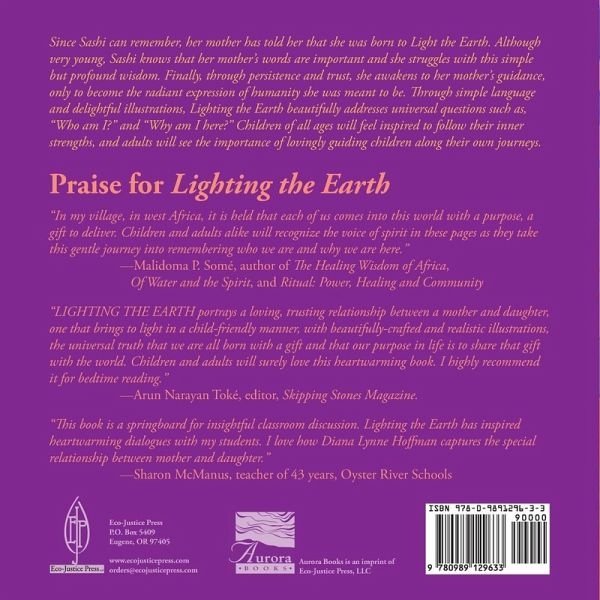 Lighting the Earth 2015 Family Choice Award Winner. 2015 Skipping Stones Magazine Honor Award Winner. Since Sashi can remember, her mother has told her that she was born to Light the Earth. Although a little too young to understand the full meaning, Sashi knows that her mother's words are important. Try as she may, year after year, Sashi struggles with this simple but profound wisdom. However through persistence and trust, she awakens to her mother's guidance, only to become the radiant expression of humanity she was meant to be. Through simple, easy-to-understand language and delightful, heartwarming illustrations, Lighting the Earth beautifully addresses Universal questions such as, "Who am I?" and "Why am I here?" Children of all ages will feel truly inspired to follow their inner strengths, and adults will see the importance of lovingly guiding children as they follow their own journeys.