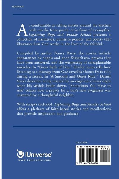 As comfortable as telling stories around the kitchen table, on the front porch, or in front of a campfire, Lightning Bugs and Sunday School presents a collection of narratives, points to ponder, and poetry that illustrates how God works in the lives of the faithful. Compiled by author Nancy Barry, the stories include appearances by angels and good Samaritans, prayers that have been answered, and the witnessing of unexplainable miracles. In "Great Balls of Fire," Shirley Jones tells how listening to a message from God saved her house from ruin during a storm. In "A Smooth and Quiet Ride," Daniel Street describes being rescued by an angel on a bitter night when his vehicle broke down. "Sometimes You Have to Ask" relates how a prayer for a boy's new eyeglasses was answered by a thoughtful neighbor. With recipes and household hints included, Lightning Bugs and Sunday School offers a plethora of faith-based stories and recollections that provide inspiration and guidance.
