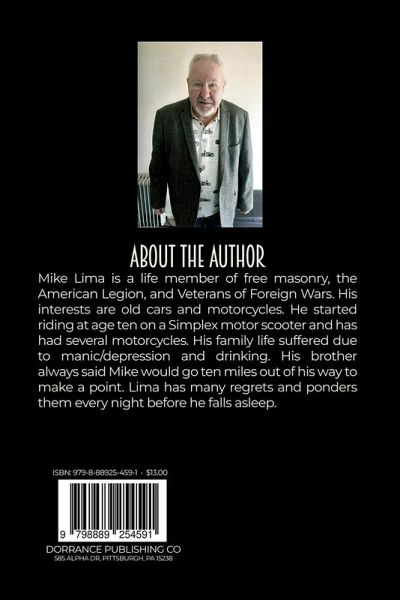 About the Author Mike Lima is a life member of free masonry, the American Legion, and Veterans of Foreign Wars. His interests are old cars and motorcycles. He started riding at age ten on a Simplex motor scooter and has had several motorcycles. His family life suffered due to manic/depression and drinking. His brother always said Mike would go ten miles out of his way to make a point. Lima has many regrets and ponders them every night before he falls asleep.