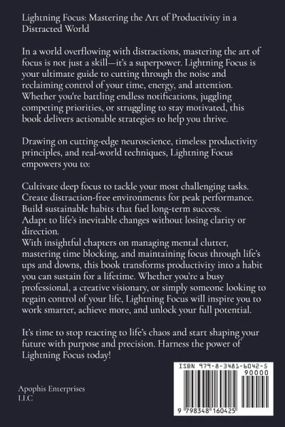 Lightning Focus: Mastering the Art of Productivity in a Distracted World In a world overflowing with distractions, mastering the art of focus is not just a skill-it's a superpower. Lightning Focus is your ultimate guide to cutting through the noise and reclaiming control of your time, energy, and attention. Whether you're battling endless notifications, juggling competing priorities, or struggling to stay motivated, this book delivers actionable strategies to help you thrive. Drawing on cutting-edge neuroscience, timeless productivity principles, and real-world techniques, Lightning Focus empowers you to:Cultivate deep focus to tackle your most challenging tasks. Create distraction-free environments for peak performance. Build sustainable habits that fuel long-term success. Adapt to life's inevitable changes without losing clarity or direction. With insightful chapters on managing mental clutter, mastering time blocking, and maintaining focus through life's ups and downs, this book transforms productivity into a habit you can sustain for a lifetime. Whether you're a busy professional, a creative visionary, or simply someone looking to regain control of your life, Lightning Focus will inspire you to work smarter, achieve more, and unlock your full potential. It's time to stop reacting to life's chaos and start shaping your future with purpose and precision. Harness the power of Lightning Focus today!