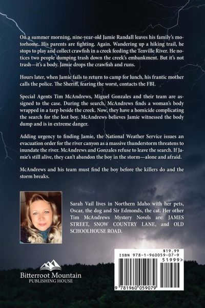 On a summer morning, nine-year-old Jamie Randall leaves his family's motorhome. His parents are fighting. Again. Wandering up a hiking trail, he stops to play and collect crawfish in a creek feeding the Tenville River. He notices two people dumping trash down the creek's embankment. But it's not trash-it's a body. Jamie drops the crawfish and runs. Hours later, when Jamie fails to return to camp for lunch, his frantic mother calls the police. The Sheriff, fearing the worst, contacts the FBI. Special Agents Tim McAndrews, Miguel Gonzales and their team are assigned to the case. During the search, McAndrews finds a woman's body wrapped in a tarp beside the creek. Now, they have a homicide complicating the search for the lost boy. McAndrews believes Jamie witnessed the body dump and is in extreme danger. Adding urgency to finding Jamie, the National Weather Service issues an evacuation order for the river canyon as a massive thunderstorm threatens to inundate the river. McAndrews and Gonzales refuse to leave the search. If Jamie's still alive, they can't abandon the boy in the storm-alone and afraid. McAndrews and his team must find the boy before the killers do and the storm breaks.