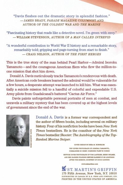 This is the story of the fighter mission that changed World War II. It is the true story of the man behind Pearl Harbor--Admiral Isoroku Yamamoto--and the courageous young American fliers who flew the million-to-one suicide mission that shot him down. Yamamoto was a cigar-smoking, poker-playing, English-speaking, Harvard-educated expert on America, and that intimate knowledge served him well as architect of the Japanese attack on Pearl Harbor. For the next sixteen months, this military genius, beloved by the Japanese people, lived up to his prediction that he would run wild in the Pacific Ocean. He was unable, however, to deal the fatal blow needed to knock America out of the war, and the shaken United States began its march to victory on the bloody island of Guadalcanal. Donald A. Davis meticulously tracks Yamamoto's eventual rendezvous with death. After American code-breakers learned that the admiral would be vulnerable for a few hours, a desperate attempt was launched to bring him down. What was essentially a suicide mission fell to a handful of colorful and expendable U.S. Army pilots from Guadalcanal's battered "Cactus Air Force": - Mississippian John Mitchell, after flunking the West Point entrance exam, entered the army as a buck private. Though not a "natural" as an aviator, he eventually became the highest-scoring army ace on Guadalcanal and the leader of the Yamamoto attack. - Rex Barber grew up in the Oregon countryside and was the oldest surviving son in a tightly knit churchgoing family. A few weeks shy of his college graduation in 1940, the quiet Barber enlisted in the U.S. Army. - "I'm going to be President of the United States," Tom Lanphier once told a friend. Lanphier was the son of a legendary fighter squadron commander and a dazzling storyteller. He viewed his chance at hero status as the start of a promising political career. - December 7, 1941, found Besby Holmes on a Pearl Harbor airstrip, firing his .45 handgun at Japanese fighters. He couldn't get airborne in time to make a serious difference, but his chance would come. - Tall and darkly handsome, Ray Hine used the call sign "Heathcliffe" because he resembled the brooding hero of Wuthering Heights. He was transferred to Guadalcanal just in time to participate in the Yamamoto mission---a mission from which he would never return. Davis paints unforgettable personal portraits of men in combat and unravels a military mystery that has been covered up at the highest levels of government since the end of the war.