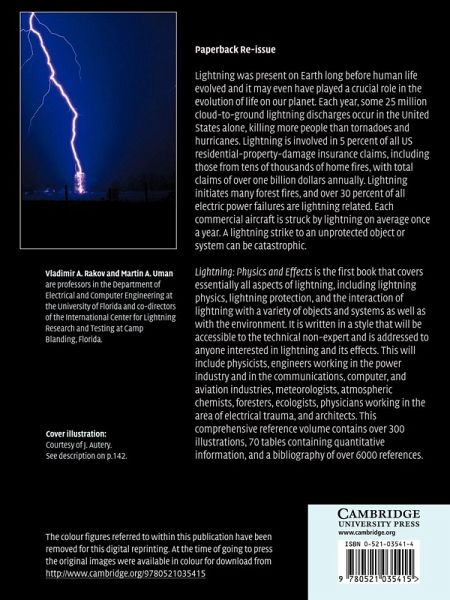 Lightning: Physics and Effects is the first book that covers essentially all aspects of lightning, including lightning physics, lightning protection and the interaction of lightning with a variety of objects and systems as well as with the environment. It is written in a style that will be accessible to the technical non-expert and is addressed to anyone interested in lightning and its effects. This will include physicists, engineers working in the power, communications, computer and aviation industries, meteorologists, atmospheric chemists, foresters, ecologists, physicians working in the area of electrical trauma and architects. This comprehensive reference volume contains over 300 illustrations, 70 tables containing quantitative information and a bibliography of more than 6000 references.