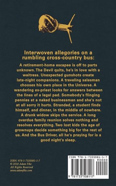 Interwoven characters measure humanity's progress on a rumbling cross-country bus. A retirement home escapee is off to parts unknown. The Devil quits (he's in love with a waitress). Unexpected gunshots create late-night companions. A traveling salesman gets to choose his own place in the Universe. A wandering ex-priest searches for answers on a messy legal pad. Somebody's flinging pennies at a naked businessman and she's not at all sorry that it hurts. Stranded, a worried student finds himself, and dinner, deep in the middle of nowhere. A drunk widow skips the service. A long overdue family reunion solves nothing and resolves everything. Then two lost, grownup kids decide something really big for the rest of us. But the Bus Driver? All he's praying for is a good night's sleep. ". . . this is a unique, intriguing offering with an overriding sense that people love and hurt and suffer, but ultimately goodness prevails. The author draws authentic characters and, often, startles with poetic imagery." - BLUEINK REVIEW "A compact yet expansive novella . . . Fike constructs a deeply human tapestry, with each thread weaving a new reflection on fate, memory, and the peculiar beauty of shared silence." - Carol Thompson, Readers' Favorite "Beautifully written, powerful, thought-provoking, and a fun little novella." - What Cathy Read Next More at AdamFike.com/books All Rights Reserved