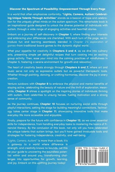 Discover the Spectrum of Possibility: Empowerment Through Every Page In a world that often emphasizes conformity, "Lights, Camera, Autism! Celebrating Unique Talents Through Activities" stands as a beacon of hope and celebration for the uniquely gifted minds on the autism spectrum. This remarkable book is an inspirational guide designed to unlock the diverse potential of individuals with autism, through a wide range of engaging activities and heartfelt stories. Embark on a journey of self-discovery in Chapter 1, where finding your interests and embracing your differences are cherished. With each turn of the page, we introduce fun and learning seamlessly blended in Chapter 2's exploration of games-from traditional board games to the dynamic digital world. Whet your appetite for creativity in Chapters 3 and 4, as we dive into culinary arts, presenting simple yet delightful recipes that turn cooking into an exciting group activity. Then, ease your mind into the calming practices of mindfulness in Chapter 5, fostering a serene environment for growth and relaxation. The heart of creativity beats strongly through Chapters 6 and 7, where art and music serve not only as expressive outlets but as powerful therapeutic tools. Whether through painting, dancing, or crafting harmonies, discover the joy in every creation. Venture outdoors with Chapter 8 to embrace the physical and mental benefits of staying active, celebrating the beauty of nature and the thrill of exploration. Meanwhile, Chapter 9 shines a spotlight on the inspiring stories of individuals thriving with autism, from celebrities to unsung heroes, fueling motivation and a strong sense of community. As the journey continues, Chapter 10 focuses on nurturing social skills through playful interactions, setting the stage for building meaningful connections. Technology takes center stage in Chapter 11, showcasing innovative tools that make everyday life more accessible and enjoyable. Finally, prepare for the future with confidence in Chapter 12, as we cover essential skills for independence, from handling everyday tasks to mastering the basics of financial literacy. By the conclusion of this book, not only will you have celebrated the unique talents that autism brings, but you'll have gained invaluable tools and strategies for fostering independence, creativity, and well-being. "Lights, Camera, Autism!" is more than a book; it's a gateway to a world where difference is strength, and creativity knows no bounds. Let this be your guide to uncovering the boundless potential within and around you, transforming challenges into opportunities for growth, learning, and joy. Embark on this uplifting journey today!