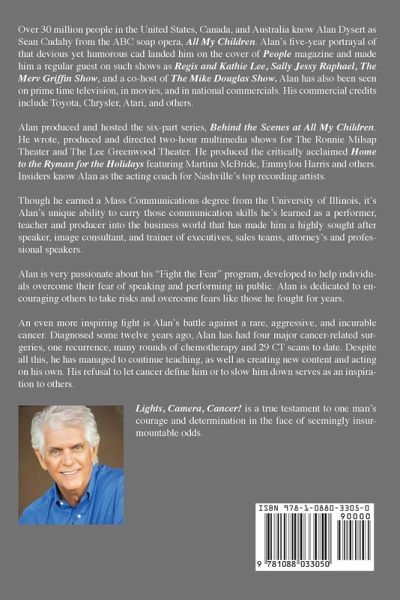 Over 30 million people in the United States, Canada, and Australia know Alan Dysert as Sean Cudahy from the ABC soap opera, All My Children. Alan's five-year portrayal of that devious yet humorous cad landed him on the cover of People magazine and made him a regular guest on such shows as Regis and Kathie Lee, Sally Jessy Raphael, The Merv Griffin Show, and a co-host of The Mike Douglas Show. Alan has also been seen on prime time television, in movies, and in national commercials. His commercial credits include Toyota, Chrysler, Atari, and others. Though he earned a Mass Communications degree from the University of Illinois, it's Alan's unique ability to carry those communication skills he's learned as a performer, teacher and producer into the business world that has made him a highly sought after speaker, image consultant, and trainer of executives, sales teams, attorney's and professional speakers. Alan is very passionate about his "Fight the Fear" program, developed to help individuals overcome their fear of speaking and performing in public. Alan is dedicated to encouraging others to take risks and overcome fears like those he fought for years. An even more inspiring fight is Alan's battle against a rare, aggressive, and incurable cancer. Diagnosed some twelve years ago, Alan has had four major cancer-related surgeries, one recurrence, many rounds of chemotherapy and 29 CT scans to date. Despite all this, he has managed to continue teaching, as well as creating new content and acting on his own. His refusal to let cancer define him or to slow him down serves as an inspiration to others. Lights, Camera, Cancer! is a true testament to one man's courage and determination in the face of seemingly insurmountable odds.