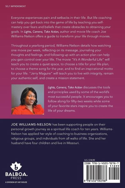 Everyone experiences pain and setbacks in their life. But life coaching can help you get back into the game of life by teaching you self-mastery over fears and beliefs that create obstacles to obtaining your goals. In Lights, Camera, Take Action, author and movie life coach Joe Williams-Nelson offers a guide to transform your life through movies. Throughout a yearlong period, Williams-Nelson details how watching one movie per week, reflecting on its message, journaling your thoughts and feelings, and following up with an action plan can help you gain control over your life. The movie ¿It¿s A Wonderful Life¿ will teach you to create a quiet space, to choose a title for your life plan, to choose a theme song for the year, and to find an inspirational motto for your life. ¿Jerry Maguire¿ will teach you to live with integrity, remain your authentic self, and create a mission statement. Lights, Camera, Take Action discusses the tools and principles used by some of the world¿s most successful people. It encourages you to follow along for fifty-two weeks while some of your favorite stars inspire you to create the life of your dreams.