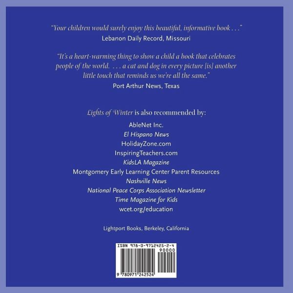 Lights of Winter is a children's picture book about winter celebrations around the world: Solstice, Yule, Christmas, Kwanza, Hanukkah, Teng Chieh, Diwali, Soyal, Las Posadas, Zagmuk, Saturnalia. For ages 3-9. Thirteen color illustrations.