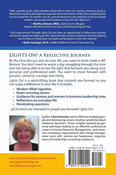 LIGHTS ON! A Reflective Journey By the time the sun sets on your life, you want to have made a difference. You don't want to waste a day struggling through the mire and not being able to to see the light that beckons you along your personal and professional path. You want to move forward with passion, certainty, courage and clarity. Lights On! is a spirit-lifting book that compels you forward so you can make a difference in your life. It includes: ¿ Wisdom-filled vignettes ¿ Heart-warming stories ¿ Guidance for women and women in business leadership roles ¿ Reflections on everyday life ¿ Penetrating questions ...all of which are intended to propel you forward! Lights On!