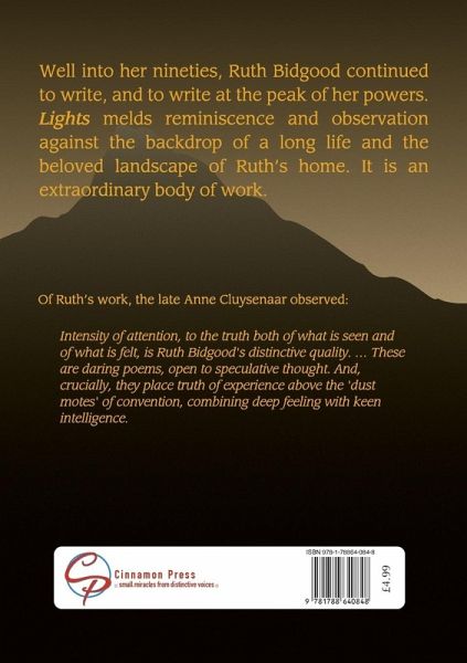 Well into her nineties, Ruth Bidgood continued to write, and to write at the peak of her powers. Lights melds reminiscence and observation against the backdrop of a long life and the beloved landscape of Ruth's home. It is an extraordinary body of work. Of Ruth's work, the late Anne Cluysenaar observed: Intensity of attention, to the truth both of what is seen and of what is felt, is Ruth Bidgood's distinctive quality. ... These are daring poems, open to speculative thought. And, crucially, they place truth of experience above the 'dust motes' of convention, combining deep feeling with keen intelligence. Welsh born and educated at Oxford, Ruth Bidgood served as a Wren during the Second World War. A sub-editor of Chambers' Encyclopedia, she eventually settled in Abergwesyn, where she started to write poems and document local history. Her poetry as been widely published and her collections had been short listed for numerous awards. Her collection, Land- music/Black Mountains, was published by Cinnamon Press in 2016.