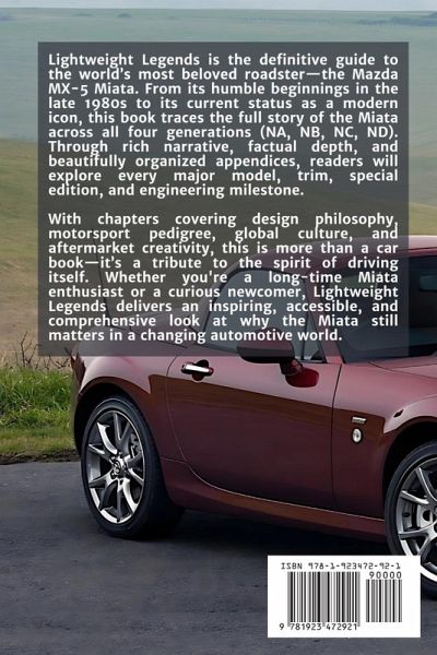 Lightweight Legends is the definitive guide to the world's most beloved roadster-the Mazda MX-5 Miata. From its humble beginnings in the late 1980s to its current status as a modern icon, this book traces the full story of the Miata across all four generations (NA, NB, NC, ND). Through rich narrative, factual depth, and beautifully organized appendices, readers will explore every major model, trim, special edition, and engineering milestone. With chapters covering design philosophy, motorsport pedigree, global culture, and aftermarket creativity, this is more than a car book-it's a tribute to the spirit of driving itself. Whether you're a long-time Miata enthusiast or a curious newcomer, Lightweight Legends delivers an inspiring, accessible, and comprehensive look at why the Miata still matters in a changing automotive world.