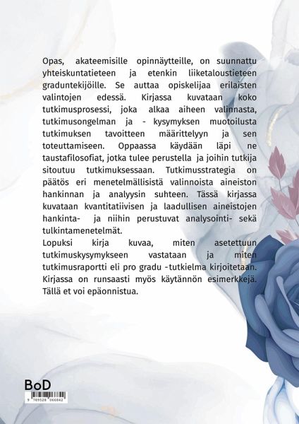 Opas, akateemisille opinnäytteille, on suunnattu yhteiskuntatieteen ja etenkin liiketaloustieteen graduntekijöille. Se auttaa opiskelijaa erilaisten valintojen edessä. Kirjassa kuvataan koko tutkimusprosessi, joka alkaa aiheen valinnasta, tutkimusongelman ja -kysymyksen muotoilusta tutkimuksen tavoitteen määrittelyyn ja sen toteuttamiseen. Oppaassa käydään läpi ne taustafilosofiat, jotka tulee perustella ja joihin tutkija sitoutuu tutkimuksessaan. Tutkimusstrategia on päätös eri menetelmällisistä valinnoista aineiston hankinnan ja analyysin suhteen. Tässä kirjassa kuvataan kvantitatiivisen ja laadullisen aineistojen hankinta- ja niihin perustuvat analysointi- sekä tulkintamenetelmät. Lopuksi kirja kuvaa, miten asetettuun tutkimuskysymykseen vastataan ja miten tutkimusraportti eli pro gradu -tutkielma kirjoitetaan. Kirjassa on runsaasti myös käytännön esimerkkejä. Tällä et voi epäonnistua.