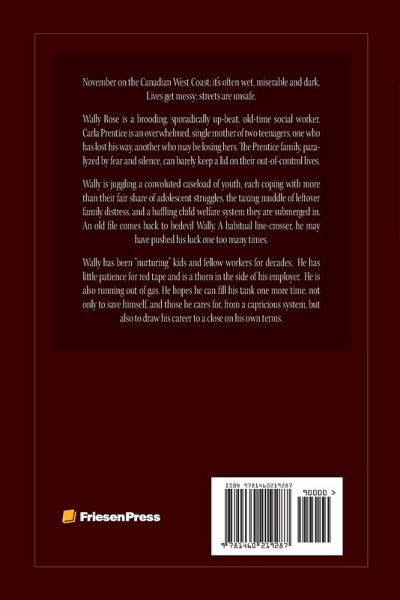 November on the Canadian West Coast; it's often wet, miserable and dark. Lives get messy; streets are unsafe. Wally Rose is a brooding, sporadically up-beat, old-time social worker. Carla Prentice is an overwhelmed, single mother of two teenagers, one who has lost his way, another who may be losing hers. The Prentice family, paralyzed by fear and silence, can barely keep a lid on their out-of-control lives. Wally is juggling a convoluted caseload of youth, each coping with more than their fair share of adolescent struggles, the taxing muddle of leftover family distress, and a baffling child welfare system they are submerged in. An old file comes back to bedevil Wally. A habitual line-crosser, he may have pushed his luck one too many times. Wally has been "nurturing" kids and fellow workers for decades. He has little patience for red tape and is a thorn in the side of his employer. He is also running out of gas. He hopes he can fill his tank one more time, not only to save himself, and those he cares for, from a capricious system, but also to draw his career to a close on his own terms. "This is a riveting story that grabbed me from its first pages. I can't remember ever reading a more realistic and entertaining tale of child protection work, or social work in general. But beyond that niche, it is a story that readers of dramatic fiction will connect with and enjoy. It is an engaging story with sympathetic and nuanced characters who will stay in readers' thoughts long after they have finished reading the book." - Sarah Stewart - Editor