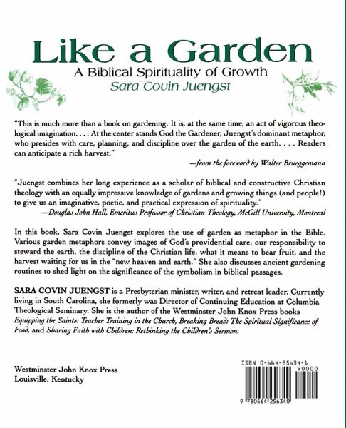 In this book, Sara Covin Juengst explores the use of garden as metaphor in the Bible. Various garden metaphors convey images of God's providential care, our responsibility to steward the earth, the discipline of the Christian life, what it means to bear fruit, and the harvest waiting for us in the "new heaven and earth". She also discusses ancient gardening routines to shed light on the significance of the symbolism in biblical passages.
