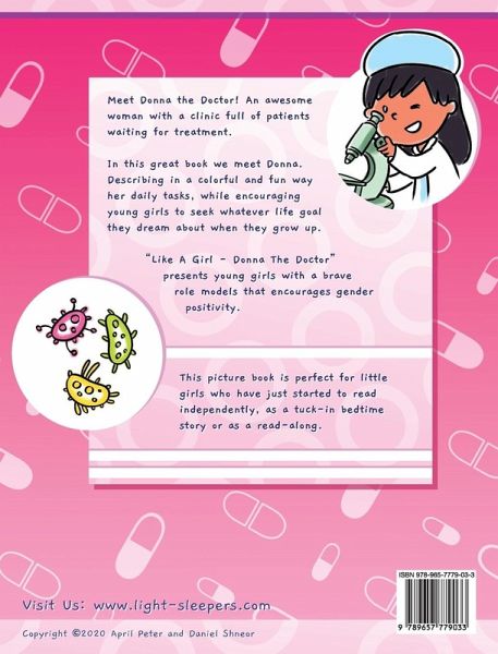 Using vibrant artwork and a show-and-tell narrative, Donna's story will present to young readers the joy of making others feel good and being the one others turn to for help. Like a Girl - Doctor is part of a series that aims to boost young girls' self esteem, and to teach them about exciting future careers they can set their sights on. The series promotes curiosity, gender positivity, empowerment, skill, ambition, team work, and being an outstanding member of society. As a bonus for our playful readers, at the end of the book you can find a collection of cut-out figures, which you can add to your own scrapbook, or use to re-enact the story on your own. Grab your copy now and join Donna in her clinic! Collect them all! Get the entire Like a Girl series and meet more inspiring professional women, including: astronaut, mechanic, firefighter, athlete, bus driver, pilot, farmer, restaurant chef and programmer.