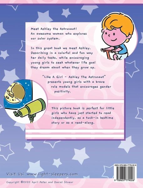 Using vibrant artwork and a show-and-tell narrative, Ashley's story will inspire young readers to reach for the stars, and to see that there's no limit to how far they can go if they put their minds to it. Like a Girl - Astronaut is part of a series that aims to boost young girls' self esteem, and to teach them about exciting future careers they can set their sights on. The series promotes curiosity, gender positivity, empowerment, skill, ambition, team work, and being an outstanding member of society. As a bonus for our playful readers, at the end of the book you can find a collection of cut-out figures, which you can add to your own scrapbook, or use to re-enact the story on your own. Grab your copy now and join Ashley's adventure! Collect them all! Get the entire Like a Girl series and meet more inspiring professional women, including: mechanic, doctor, firefighter, athlete, bus driver, pilot, farmer, restaurant chef and programmer.