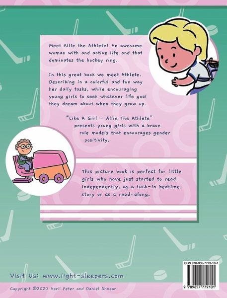 Meet Allie the Athlete! Allie and her hockey team are training hard for the big game, and you're invited to cheer them on! Using vibrant artwork and a show-and-tell narrative, Allie's story will introduce young readers to the concept of working hard to perfect your talent and become a hero to your fans. Like a Girl - Athlete is part of a series that aims to boost young girls' self esteem, and to teach them about exciting future careers they can set their sights on. The series promotes curiosity, gender positivity, empowerment, skill, ambition, teamwork, and being an outstanding member of society. As a bonus for our playful readers, at the end of the book you can find a collection of cut-out figures, which you can add to your own scrapbook, or use to re-enact the story on your own. Grab your copy now and cheer Allie on as she leads her team to victory! Collect them all! Get the entire Like a Girl series and meet more inspiring professional women, including: astronaut, farmer, restaurant chef, firefighter, doctor, pilot, bus driver, programmer and mechanic.