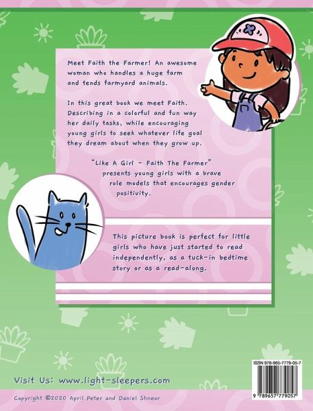 Meet Faith the Farmer! Faith wakes up early every morning to take care of the animals and crops on her farm, and you're invited to join her! Using vibrant artwork and a show-and-tell narrative, Faith's story will present to young readers the joy of working outdoors, caring for animals, and growing organic fruits and vegetables. Like a Girl - Farmer is part of a series that aims to boost young girls' self esteem, and to teach them about exciting future careers they can set their sights on. The series promotes curiosity, gender positivity, empowerment, skill, ambition, teamwork, and being an outstanding member of society. As a bonus for our playful readers, at the end of the book you can find a collection of cut-out figures, which you can add to your own scrapbook, or use to re-enact the story on your own. Grab your copy now and get your hands dirty on Faith's farm! Collect them all! Get the entire Like a Girl series and meet more inspiring professional women, including: astronaut, mechanic, firefighter, athlete, doctor, pilot, bus driver, restaurant chef and programmer.