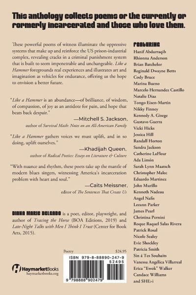 Like A Hammer is an anthology of poems that unearths the shared traumas produced by America's incarceration system. These powerful poems of witness seek to address the oppressive systems that make up the US prison-industrial complex, revealing cracks in a criminal punishment system that too often appears unchangeable. The impacts of that system reverberate through lives and across generations. The poets gathered here aim to foreground the real experiences of people touched by the system, to upend dominant narratives, shine light on injustice, and act as a fulcrum around which to organize communities in support of change. Like A Hammer explores how art and imagination can serve as vehicles for endurance, offering us the hope to envision a better future. Contributors include: Hanif Abdurraqib, Rhionna Anderson, Brian Batchelor, Reginald Dwayne Betts, Marina Bueno, Cody Bruce, Marcelo Hernandez Castillo, Natalie Diaz, Tongo Eisen-Martin, Nikky Finney, Kennedy A. Gisege, Gustavo Guerra, Jessica Hill, Vicki Hicks, Randall Horton, Sandra Jackson, Catherine LaFleur, Ada Limón, Sarah Lynn Maatsch, Christopher Malec, Eduardo Martinez, John Murillo, Angel Nafis, Kenneth Nadeau, Leeann Parker, James Pearl, Christina Pernini, Roque Raquel Salas Rivera, Patrick Rosal, Nicole Sealey, Evie Shockley, Patricia Smith, Sin á Tes Souhaits, Vanessa Angélica Villarreal, Erica "Ewok" Walker, Candace Williams, and SHE>i