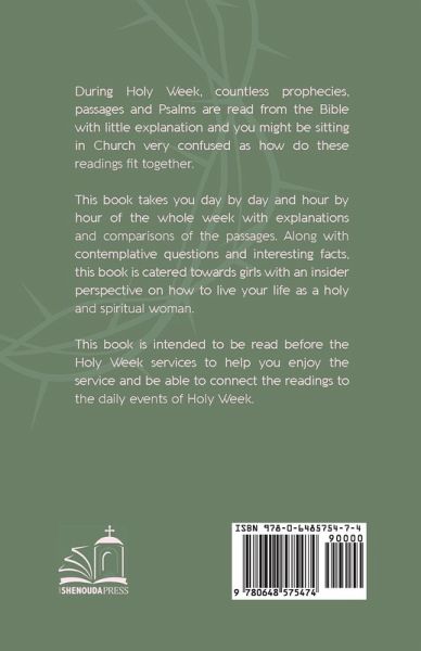 During Holy Week, countless prophecies, passages and Psalms are read from the Bible with little explanation and you might be sitting in Church very confused as how do these readings fit together. This book takes you day by day and hour by hour of the whole week with explanations and comparisons of the passages. Along with contemplative questions and interesting facts, this book is catered towards girls with an insider perspective on how to live your life as a holy and spiritual woman. This book is intended to be read before the Holy Week services to help you enjoy the service and be able to connect the readings to the daily events of Holy Week.