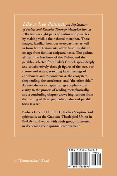 How well are the psalms understood? The parables seem more accessible, but are they? And as familiar as we are with the texts of the psalms and the parables, how open are we to new perspectives on them? The studies in Like a Tree Planted, the first volume in the Connections series, encourage readers to deepen their understanding of the psalms and parables and to grow in their relationship with God. Like a Tree Planted invites reflection on eight pairs of psalms and parables by highlighting their shared metaphor. These images, familiar from our everyday lives as well as from both testaments, encourage fresh insights from familiar scriptural texts. The psalms presented here, all from the first book of the Psalter, and the parables, selected from Luke's Gospel, speak deeply and collaboratively through figures of the tree, our stature and status, searching faces, feelings of entitlement and responsiveness, the ecosystem, shepherding, the storehouse, and "the other side." An introductory chapter in Like a Tree Planted introduces readers to the process of reading metaphorically, and a concluding chapter draws implications from the reading of these particular psalm and parable texts as a set.