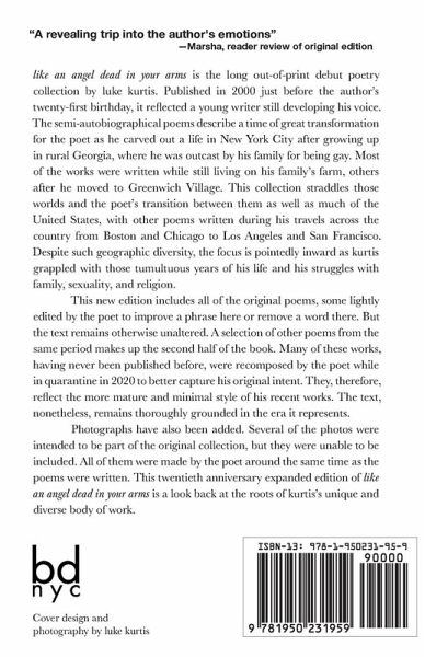 like an angel dead in your arms is the long out-of-print debut poetry collection by luke kurtis. Published in 2000 just before the author's twenty-first birthday, it reflected a young writer still developing his voice. The semi-autobiographical poems describe a time of great transformation for the poet as he carved out a life in New York City after growing up in rural Georgia, where he was outcast by his family for being gay. Most of the works were written while still living on his family's farm, others after he moved to Greenwich Village. This collection straddles those worlds and the poet's transition between them as well as much of the United States, with other poems written during his travels across the country from Boston and Chicago to Los Angeles and San Francisco. Despite such geographic diversity, the focus is pointedly inward as kurtis grappled with those tumultuous years of his life and his struggles with family, sexuality, and religion. This new edition includes all of the original poems, some lightly edited by the poet to improve a phrase here or remove a word there. But the text remains otherwise unaltered. A selection of other poems from the same period makes up the second half of the book. Many of these works, having never been published before, were recomposed by the poet while in quarantine in 2020 to better capture his original intent. They, therefore, reflect the more mature and minimal style of his recent works. The text, nonetheless, remains thoroughly grounded in the era it represents. Photographs have also been added. Several of the photos were intended to be part of the original collection, but they were unable to be included. All of them were made by the poet around the same time as the poems were written. This twentieth anniversary expanded edition of like an angel dead in your arms is a look back at the roots of kurtis's unique and diverse body of work.