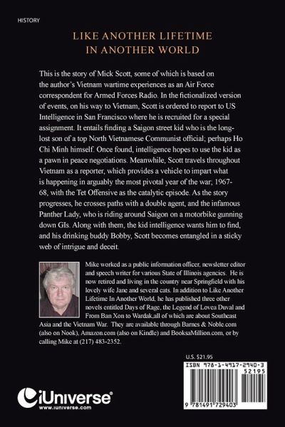 This is the story of Mick Scott, some of which is based on the author's Vietnam wartime experiences as an Air Force correspondent for Armed Forces Radio. In the fictionalized version of events, on his way to Vietnam, Scott is ordered to report to US Intelligence in San Francisco where he is recruited for a special assignment. It entails finding a Saigon street kid who is the long-lost son of a top North Vietnamese Communist official; perhaps Ho Chi Minh himself. Once found, intelligence hopes to use the kid as a pawn in peace negotiations. Meanwhile, Scott travels throughout Vietnam as a reporter, which provides a vehicle to impart what is happening in arguably the most pivotal year of the war; 1967-68, with the Tet Offensive as the catalytic episode. As the story progresses, he crosses paths with a double agent, and the infamous Panther Lady, who is riding around Saigon on a motorbike gunning down GIs. Along with them, the kid intelligence wants him to find, and his drinking buddy Bobby, Scott becomes entangled in a sticky web of intrigue and deceit.