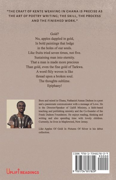 "In "Like Apples of Gold In Pictures of Silver", Nathaniel Annan Dadson takes readers on a journey of reimagining God, life, love, relationships, identity and heritage. The perspectives he unveils about these core essentials of life are stunning and transforming. Throughout the book, he experiments the wonder and aesthetics of poetry. This is reinforced in the message of the book's title "a word fitly spoken is like apples of gold in pictures of silver." Dadson asserts that the craft of kente weaving in Ghana is precise as the art of poetry writing; the skill, the process, and the finished work. With a strong passion, he explores his Ghanaian heritage and addresses current issues in his country and Africa. The collection is considerably a handbook for people searching for meaning and purpose in life. The author shares poems from his personal experiences and reflections with uniqueness of style that shows his command of the talent"--