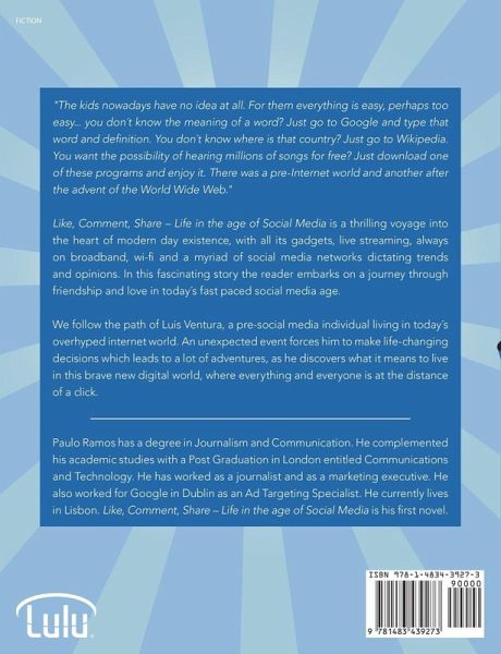 "The kids nowadays have no idea at all. For them everything is easy, perhaps too easy... you don¿t know the meaning of a word? Just go to Google and type that word and definition. You don¿t know where is that country? Just go to Wikipedia. You want the possibility of hearing millions of songs for free? Just download one of these programs and enjoy it. There was a pre-Internet world and another after the advent of the World Wide Web." Like, Comment Share: Life in the age of Social Media is a thrilling voyage into the heart of modern day existence, with all its gadgets, live streaming, always on broadband, wi-fi and a myriad of social media networks dictating trends and opinions. In this fascinating story the reader embarks on a journey through friendship and love in today¿s fast-paced social media age.