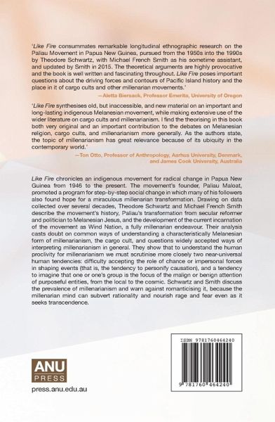 Like Fire chronicles an indigenous movement for radical change in Papua New Guinea from 1946 to the present. The movement's founder, Paliau Maloat, promoted a program for step-by-step social change in which many of his followers also found hope for a miraculous millenarian transformation. Drawing on data collected over several decades, Theodore Schwartz and Michael French Smith describe the movement's history, Paliau's transformation from secular reformer and politician to Melanesian Jesus, and the development of the current incarnation of the movement as Wind Nation, a fully millenarian endeavour. Their analysis casts doubt on common ways of understanding a characteristically Melanesian form of millenarianism, the cargo cult, and questions widely accepted ways of interpreting millenarianism in general. They show that to understand the human proclivity for millenarianism we must scrutinise more closely two near-universal human tendencies: difficulty accepting the role of chance or impersonal forces in shaping events (that is, the tendency to personify causation), and a tendency to imagine that one or one's group is the focus of the malign or benign attention of purposeful entities, from the local to the cosmic. Schwartz and Smith discuss the prevalence of millenarianism and warn against romanticising it, because the millenarian mind can subvert rationality and nourish rage and fear even as it seeks transcendence.--From publisher's website.