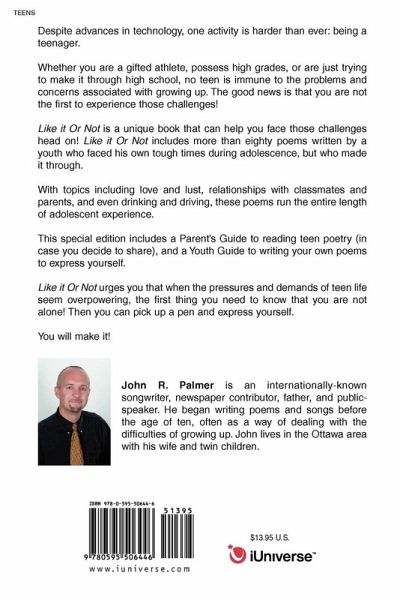Despite advances in technology, one activity is harder than ever: being a teenager. Whether you are a gifted athlete, possess high grades, or are just trying to make it through high school, no teen is immune to the problems and concerns associated with growing up. The good news is that you are not the first to experience those challenges! Like it Or Not is a unique book that can help you face those challenges head on! Like it Or Not includes more than eighty poems written by a youth who faced his own tough times during adolescence, but who made it through. With topics including love and lust, relationships with classmates and parents, and even drinking and driving, these poems run the entire length of adolescent experience. This special edition includes a Parent's Guide to reading teen poetry (in case you decide to share), and a Youth Guide to writing your own poems to express yourself. Like it Or Not urges you that when the pressures and demands of teen life seem overpowering, the first thing you need to know that you are not alone! Then you can pick up a pen and express yourself. You will make it!
