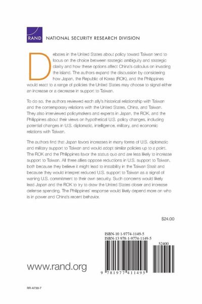 Debates in the United States about policy toward Taiwan tend to focus on the choice between strategic ambiguity and strategic clarity and how these options affect China's calculus on invading the island. The authors expand the discussion by considering how Japan, the Republic of Korea (ROK), and the Philippines would react to a range of policies the United States may choose to signal either an increase or a decrease in support to Taiwan. To do so, the authors reviewed each ally's historical relationship with Taiwan and the contemporary relations with the United States, China, and Taiwan. They also interviewed policymakers and experts in Japan, the ROK, and the Philippines about their views on hypothetical U.S. policy changes, including potential changes in U.S. diplomatic, intelligence, military, and economic relations with Taiwan. The authors find that Japan favors increases in many forms of U.S. diplomatic and military support to Taiwan and would adopt similar policies up to a point. The ROK and the Philippines favor the status quo and are less likely to increase support to Taiwan. All three allies oppose reductions in U.S. support to Taiwan, both because they believe it might lead to instability in the Taiwan Strait and because they would interpret reduced U.S. support to Taiwan as a signal of waning U.S. commitment to their own security. Such concerns would likely lead Japan and the ROK to try to draw the United States closer and increase defense spending. The Philippines' response would likely depend more on who is in power and China's recent behavior.