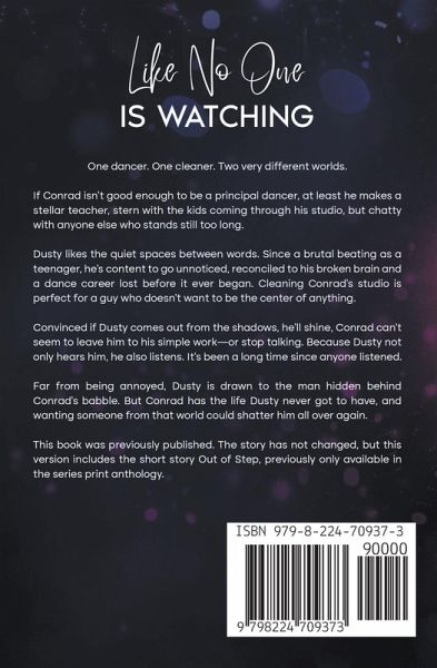 One dancer. One cleaner. Two very different worlds. If Conrad isn't good enough to be a principal dancer, at least he makes a stellar teacher, stern with the kids coming through his studio, but chatty with anyone else who stands still too long. Dusty likes the quiet spaces between words. Since a brutal beating as a teenager, he's content to go unnoticed, reconciled to his broken brain and a dance career lost before it ever began. Cleaning Conrad's studio is perfect for a guy who doesn't want to be the center of anything. Convinced if Dusty comes out from the shadows, he'll shine, Conrad can't seem to leave him to his simple work-or stop talking. Because Dusty not only hears him, he also listens. It's been a long time since anyone listened. Far from being annoyed, Dusty is drawn to the man hidden behind Conrad's babble. But Conrad has the life Dusty never got to have, and wanting someone from that world could shatter him all over again. This book was previously published. The story has not changed, but this version includes the short story Out of Step, previously only available in the series print anthology.